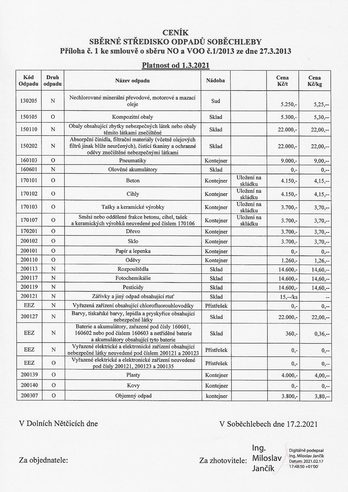 Úvod > Život v obci > Aktuality > Ceník – Sběrné středisko odpadů Soběchleby