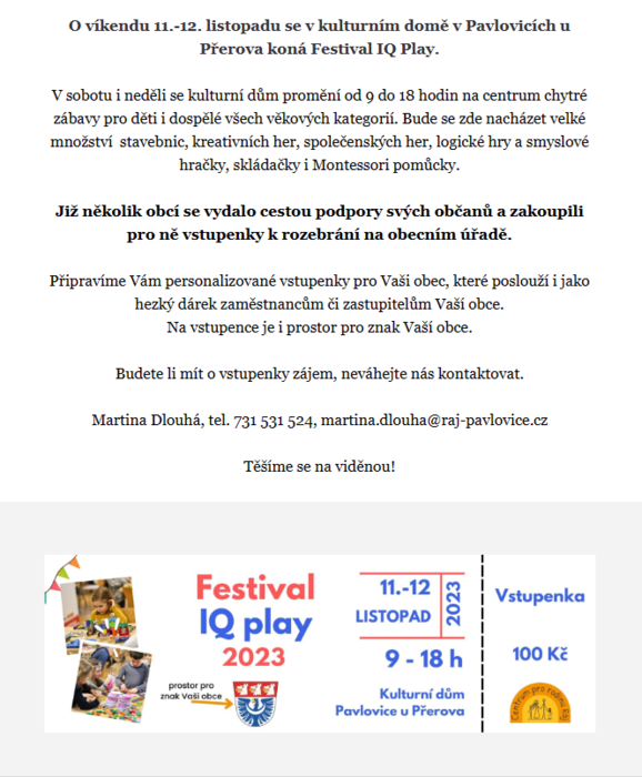 Úvod > Život v obci > Aktuality > Festival IQ Play Pavlovice 10-11.11.2023