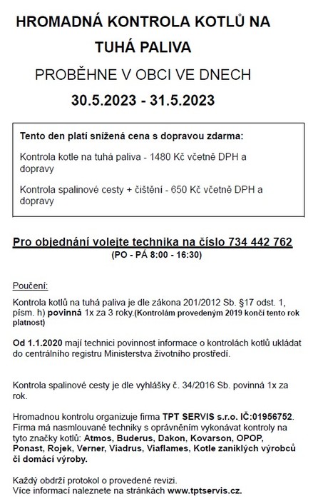 Úvod > Život v obci > Aktuality > Kontroly kotlů a spalinových cest - 30.5.2023 - 31.5.2023
