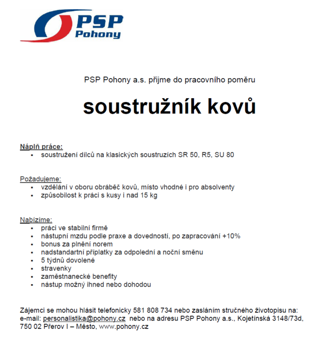 Úvod > Život v obci > Aktuality > Nabídka práce - soustružník kovů