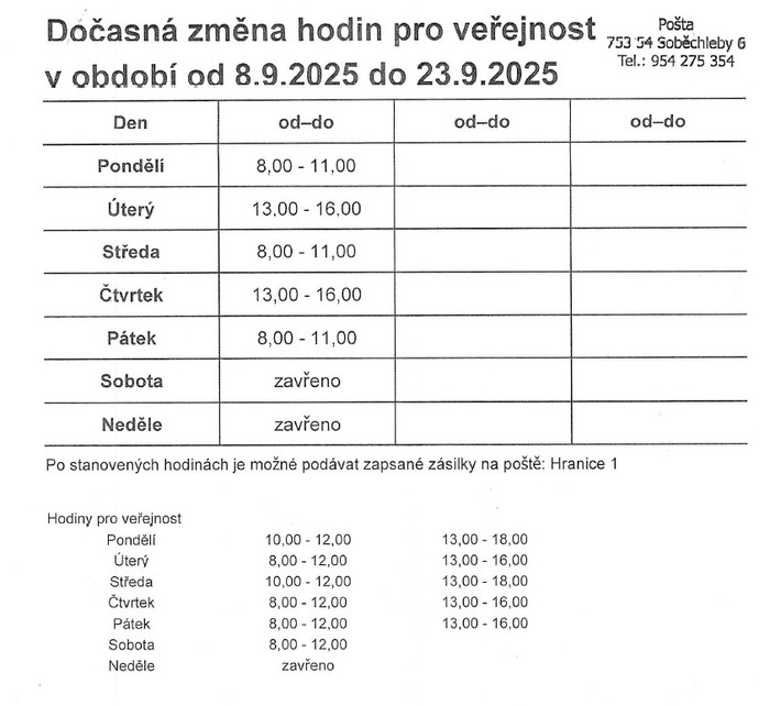 Úvod > Život v obci > Aktuality > Provozní doba pošty Soběchleby