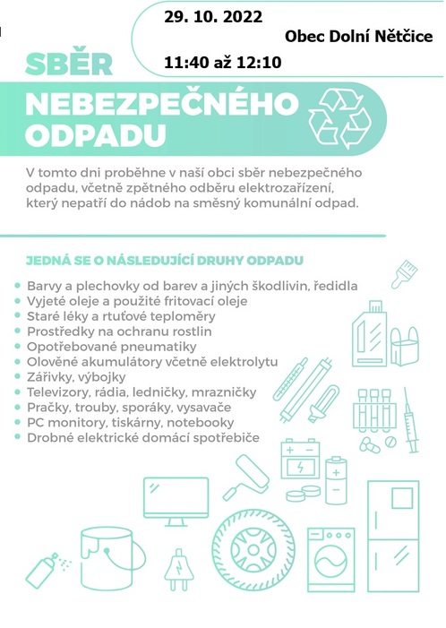 Úvod > Život v obci > Aktuality > Sběr nebezpečného odpadu 29.10.2022 11:40-12:10