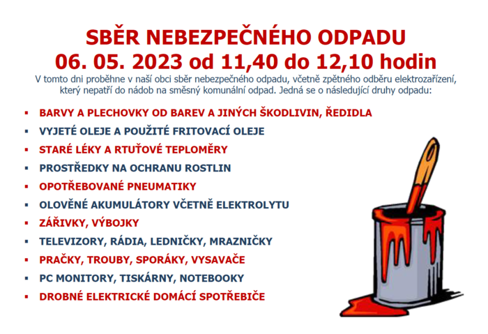Úvod > Život v obci > Aktuality > Sběr nebezpečného odpadu 6.5.2023 11:40 - 12:10