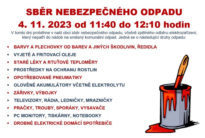 Úvod > Život v obci > Aktuality > Svoz nebezpečného odpadu 4.11.2023