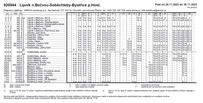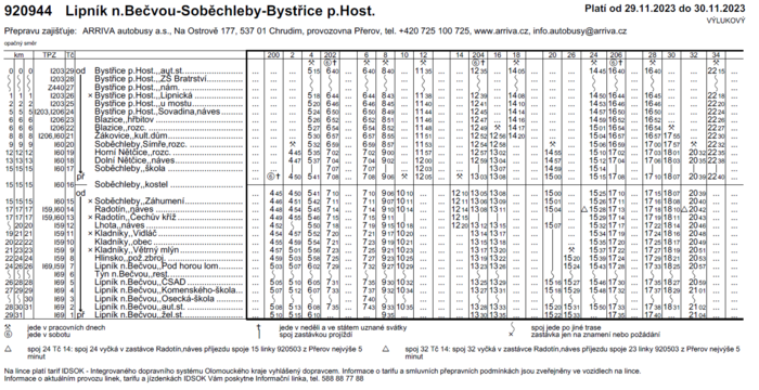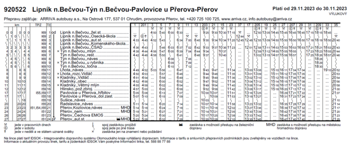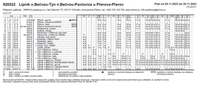 Výlukové jízdní řády linek 920522 a 920944, dotčené uzavírkou silnice II/437 v obci Týn nad Bečvou, platné od 29. 11. 2023 do 30. 11. 2023.