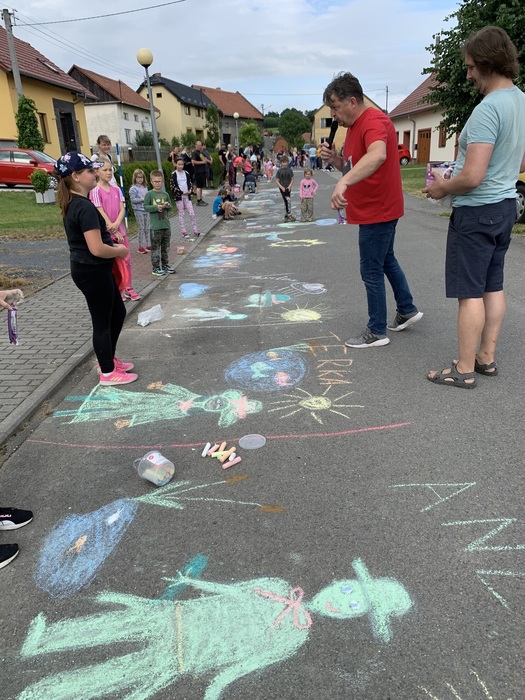 V sobotu 24. června jsme společně přivítali prázdniny. Malovali jsme na asfalt na téma Rybník a vodníci, protože byla dostavěna již druhá vodní nádrž Pod Skalkou. Soutěžilo se a tancovalo. Děti si vyzkoušeli bublinkování a ještě byli krásně pomalováni. Také se řezalo na čas dřevo ruční pilou.